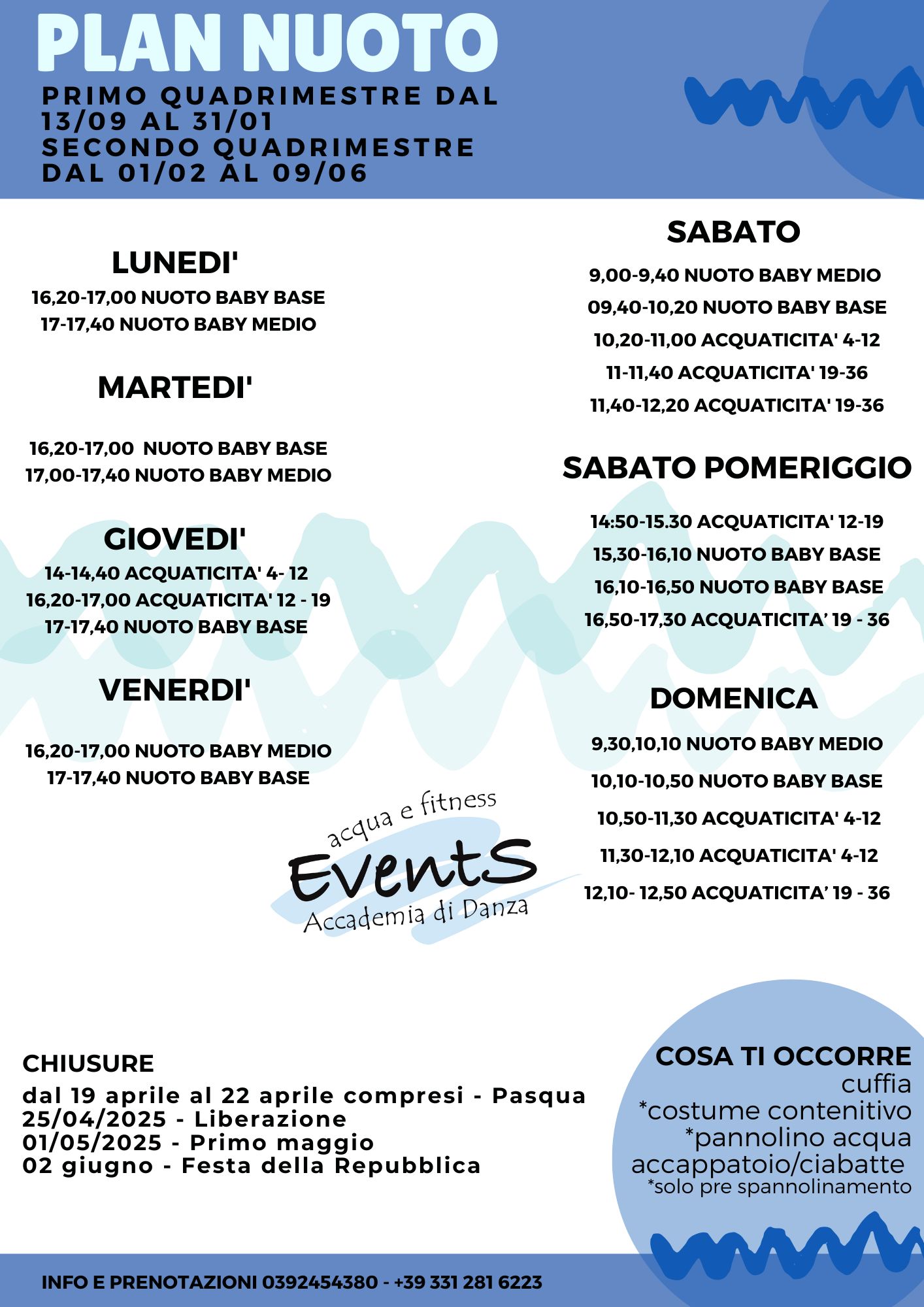 SCUOLA NUOTO E ACQUATICITA' Correlato a NUOTO plan nuoto.jpg 300 KB Scarica Articoli correlati Plan corsi Palestra Plan corsi Piscina ➡️clicca su INVIA UNA RICHIESTA E CHIEDI INFO!⬅️ WINTER SPASSO CAMP 2025 22 - 23 & 29 - 30 DICEMBRE SALE PER FESTE - Teatro degli Eventi - Via Caravaggio 22 LISSONE